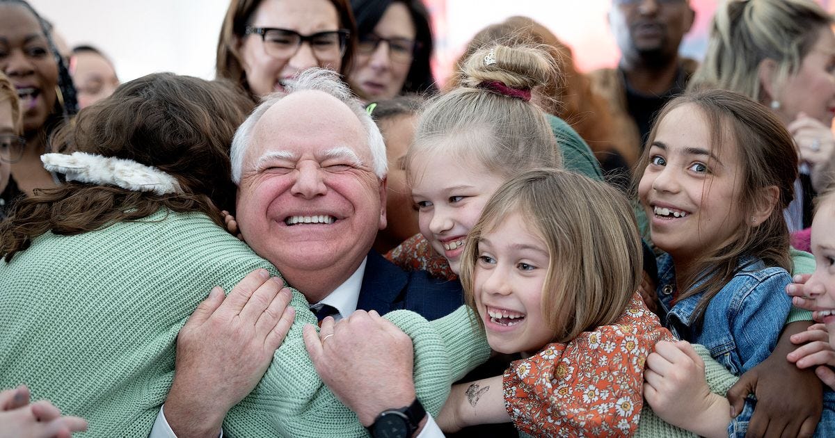Speaking of Tim Walz, let’s look at this bizarre photo above. He is surrounded by little White girls. A few Black adults in the background, but still a shocking lack of “diversity” for America 2.0. Can we identify that bizarre expression on Walz’s face? Is it orgasmic? Maniacal? Psychotic? It’s certainly frighteningly passionate. And what’s with the green sweater on the perhaps adult, maybe older girl whose arm Walz is hugging? How could some of her sweater appear all the way to the right of the photo, where a Black hand is coming out of the sleeve? What is she- Elastic Lass? This can’t possibly be the woman/girl who is embracing Walz on the left side of the photo. And Elastic Lass has her impossibly long arm around a little girl who has an unusually ecstatic grin on her face herself. I hope they paid these kids well.
